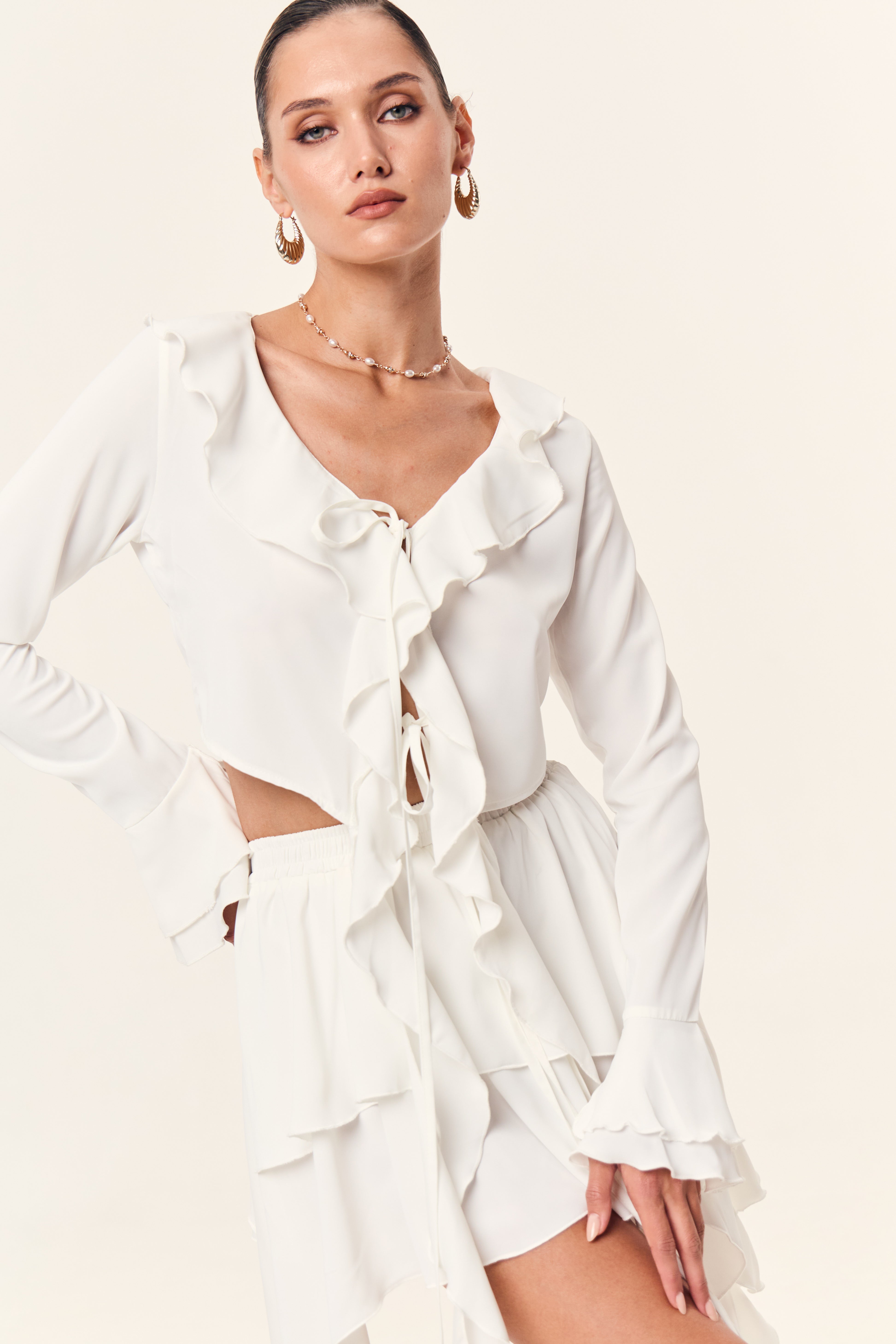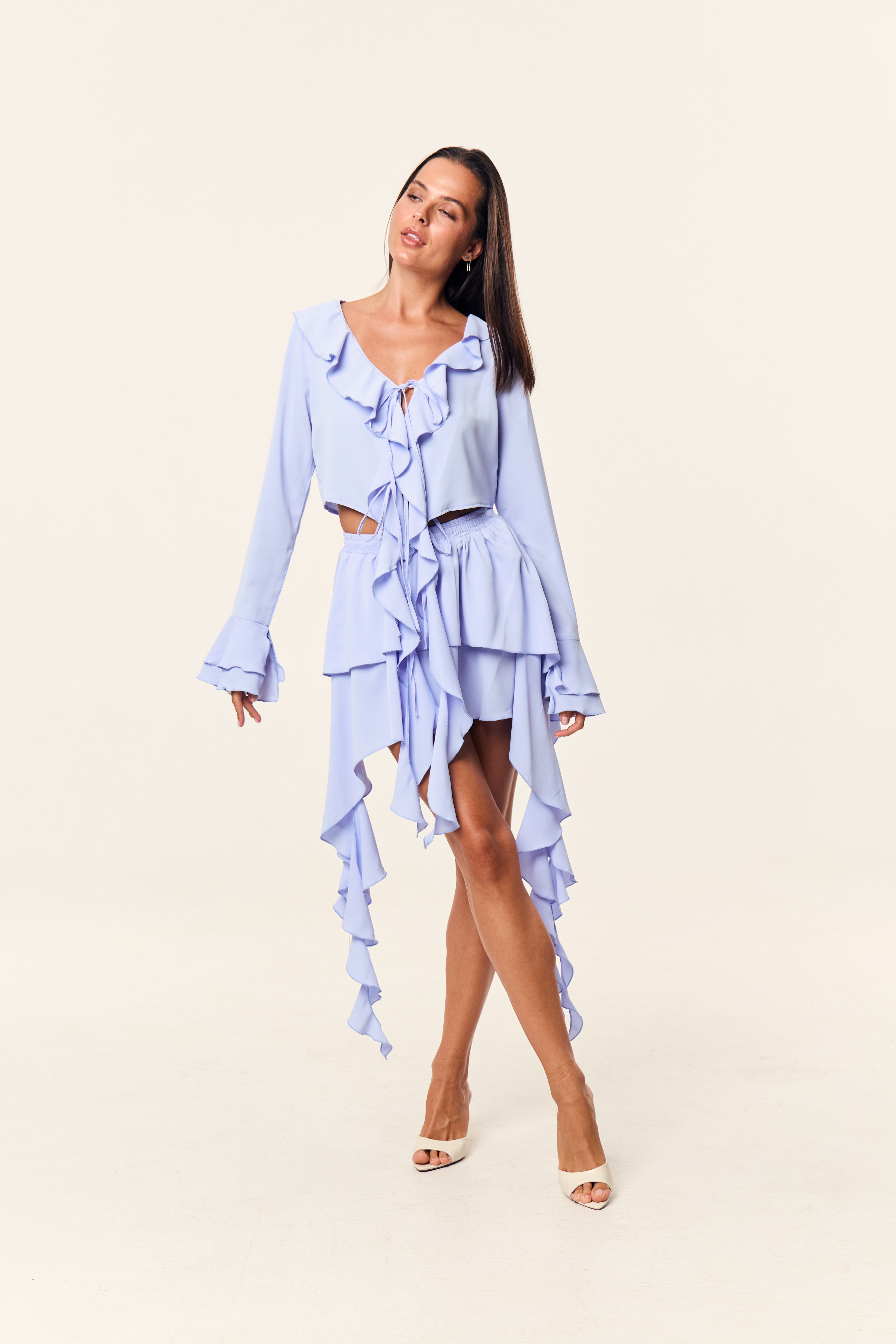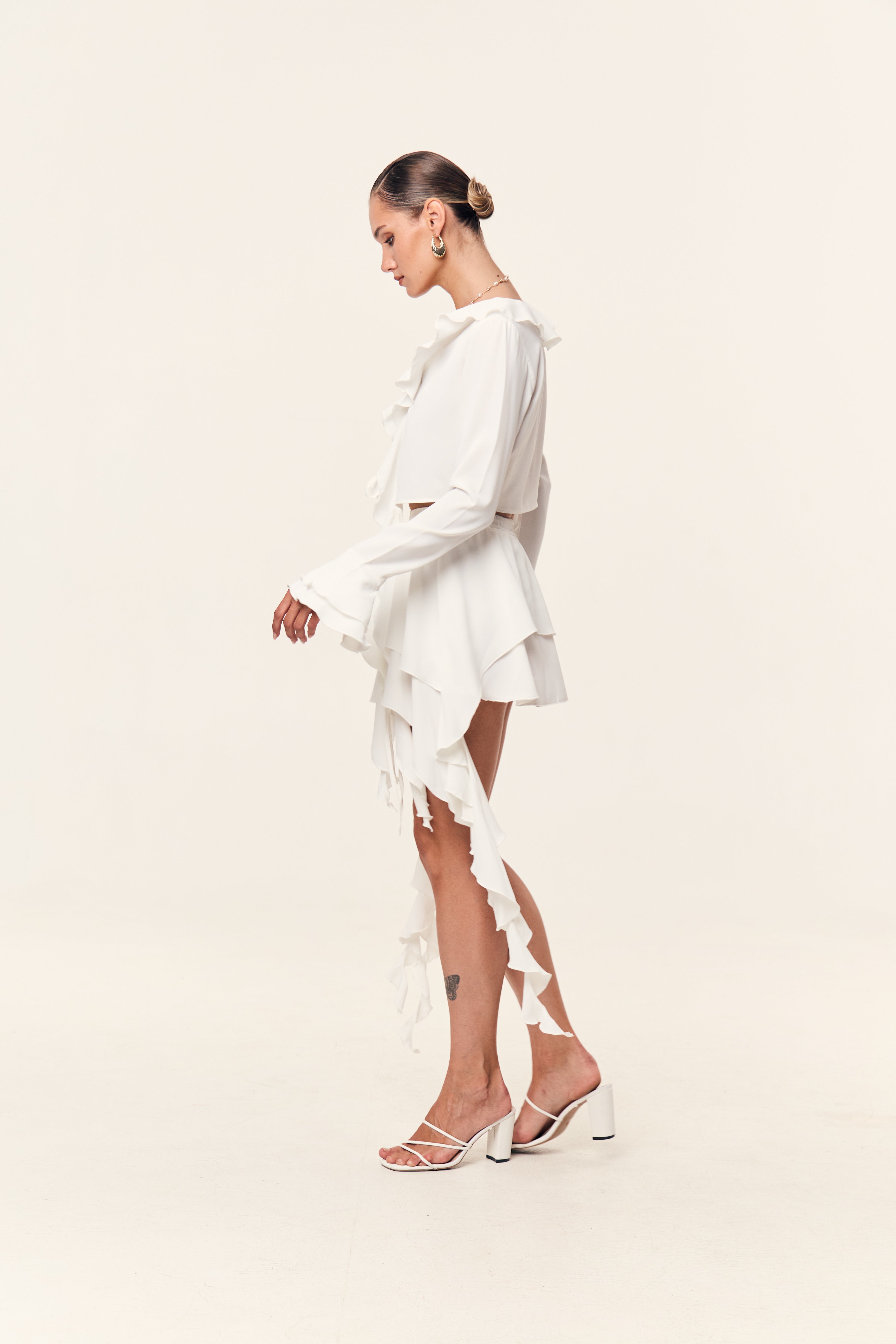 Featuring a charming ruffled top and a beautifully draped, asymmetrical skirt, perfect for a romantic and modern statement.