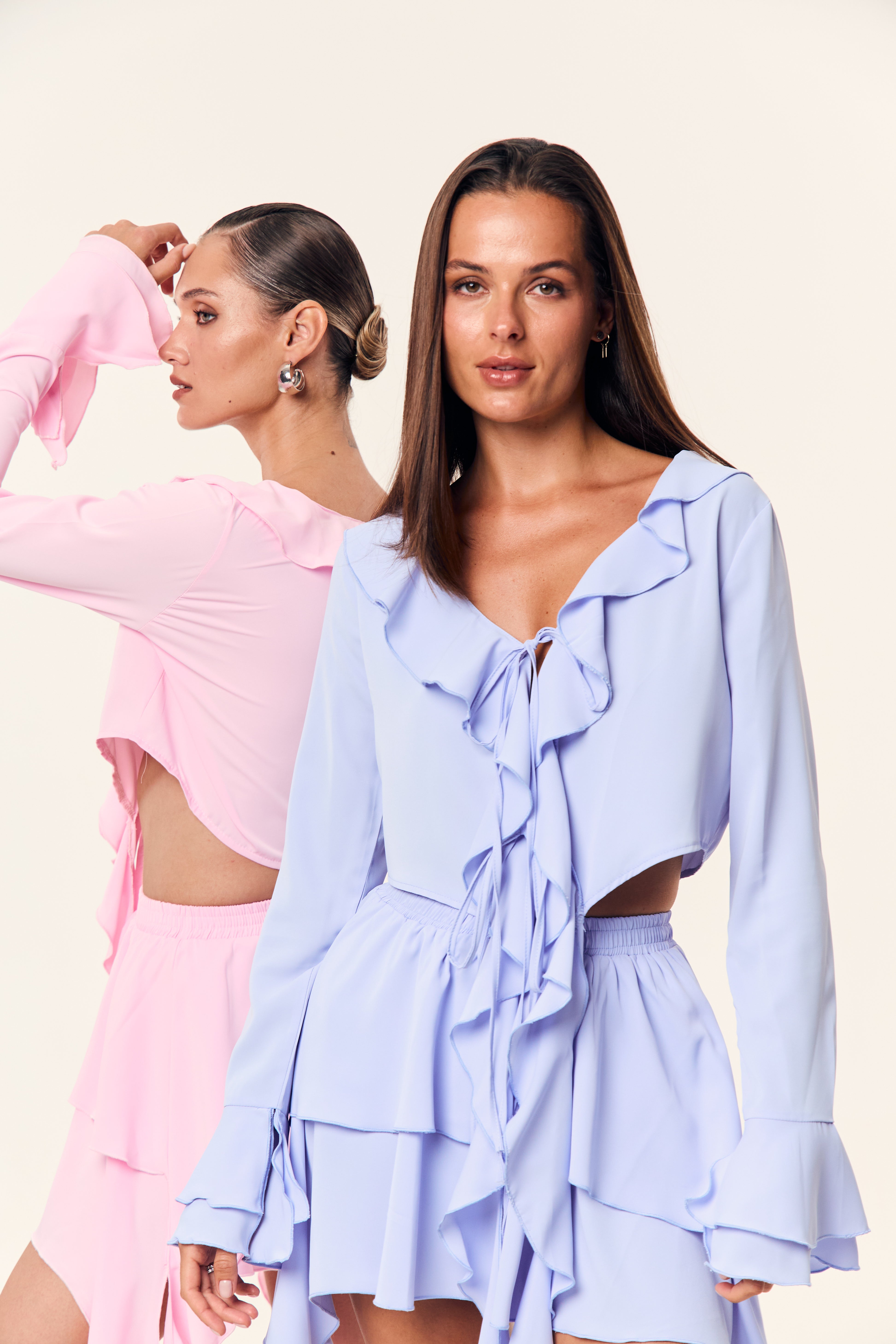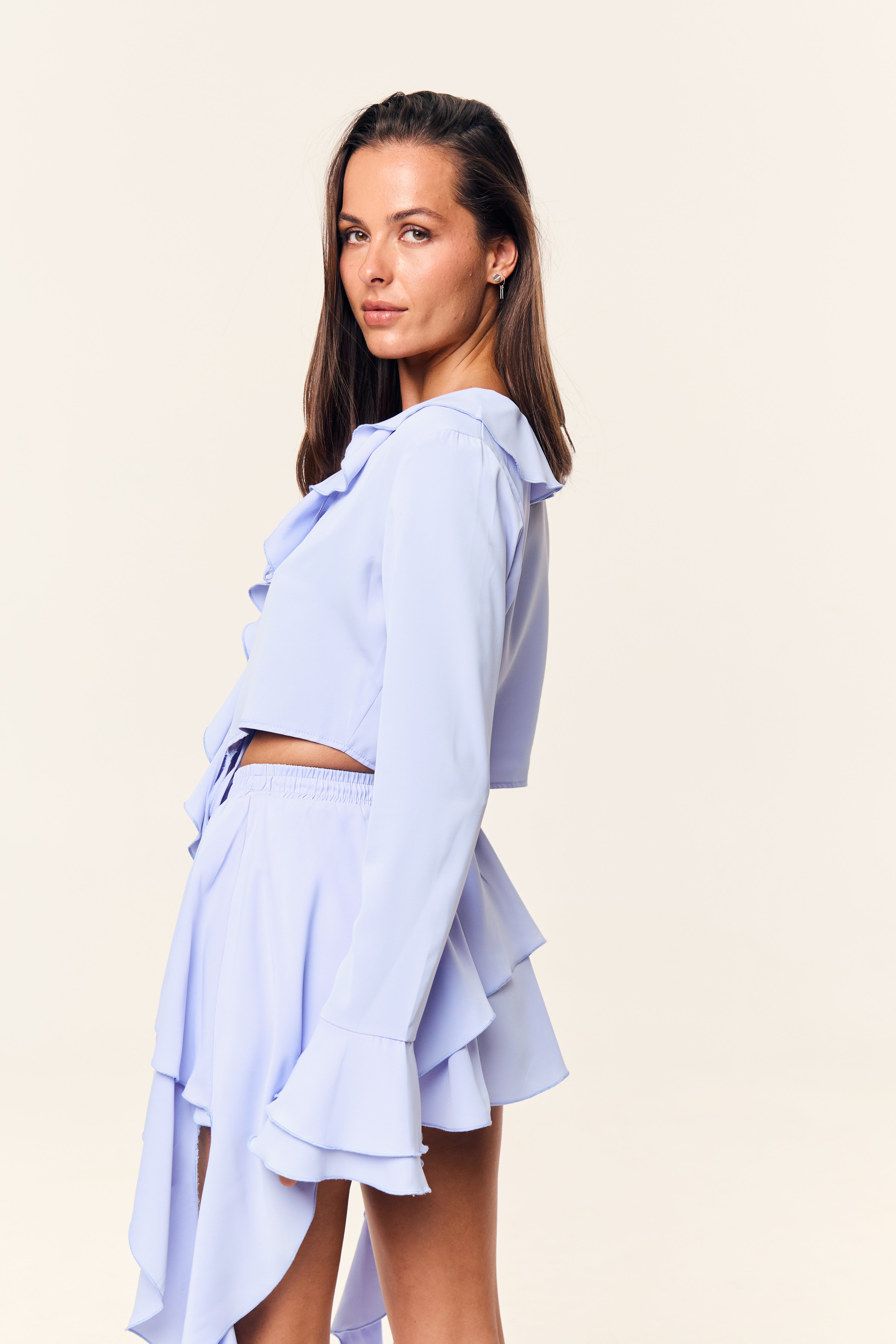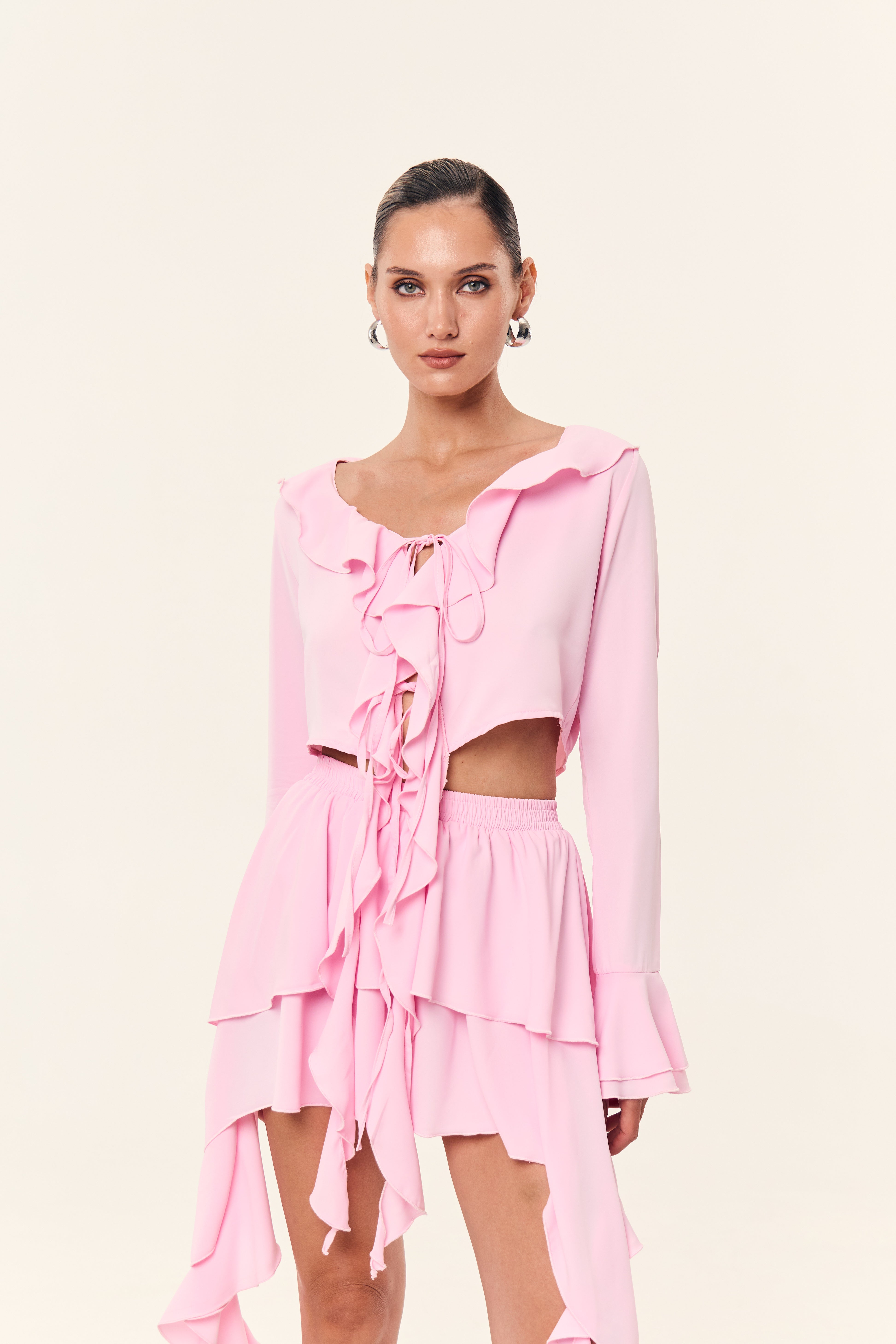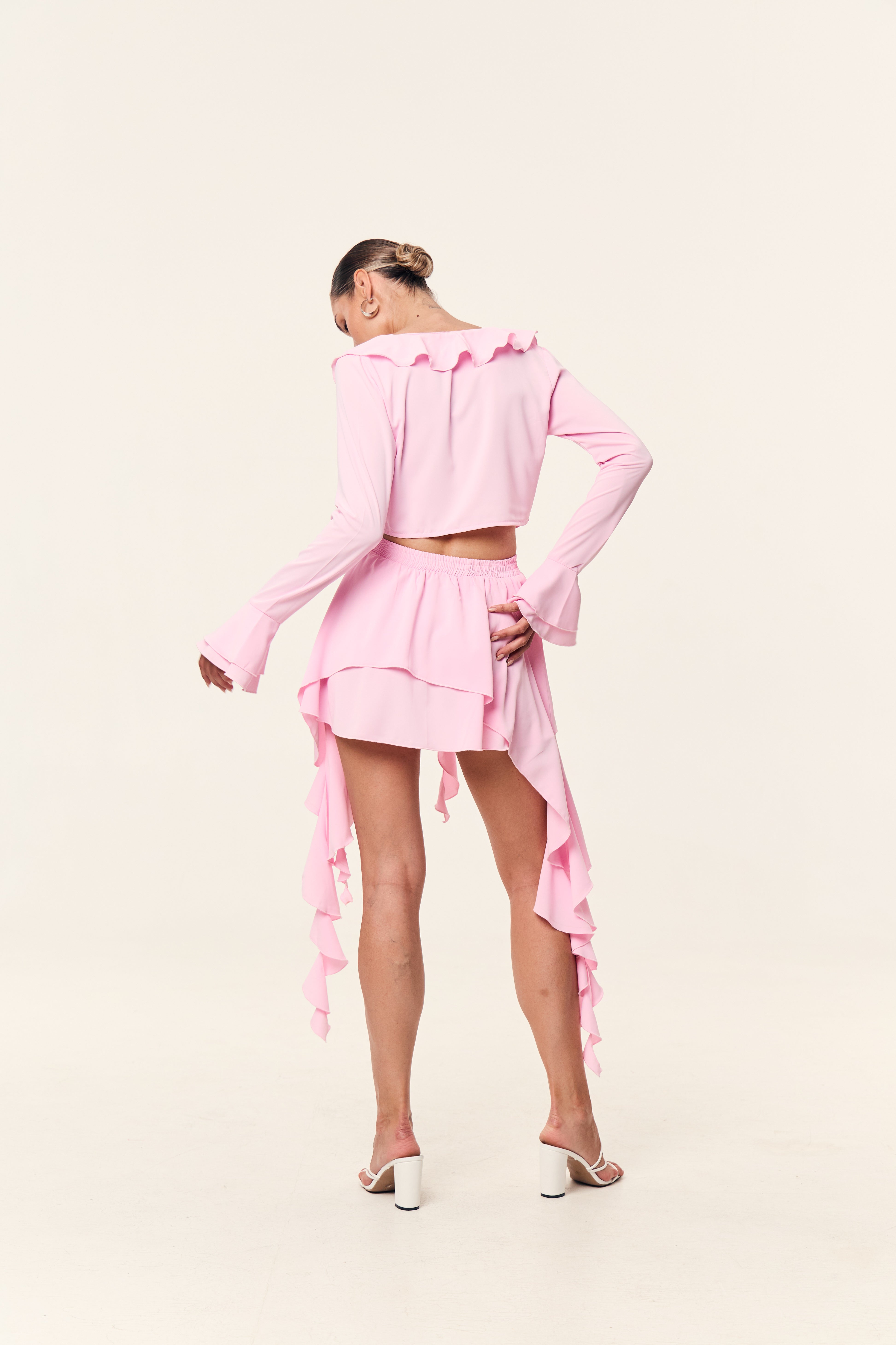 Featuring a charming ruffled top and a beautifully draped, asymmetrical skirt, perfect for a romantic and modern statement.
